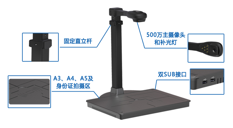 幅面尺寸拍摄尺寸:A3 、A4 、A5、A6、名片/身份证各类证件、文档、书籍、立体物品、图片、照片、杂志等;外观尺寸:360mm(L)x340mm(W)x404mm(H ) ;机身:ABS(头壳)+铝合金+ABS(底座);机身可上下伸缩,切换拍摄A3/A4幅面文件;硬质文稿台四个角可拉伸出来,切换A3/A4底座幅面;底座上带有身份证凹槽