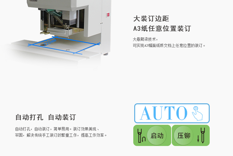 • 其它可实现A3幅面上任意位置的装订 装订边距达220mm  超大工作台面 达到500*360mm。