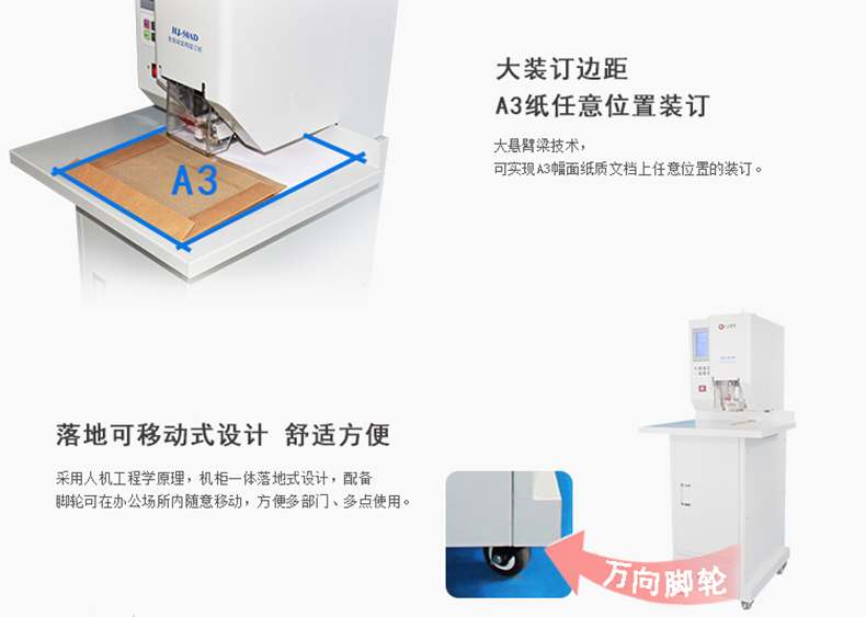 其它可实现A3幅面上任意位置的装订 装订边距达210mm 机柜一体化 落地可移动式设计 .彩色液晶显示屏。