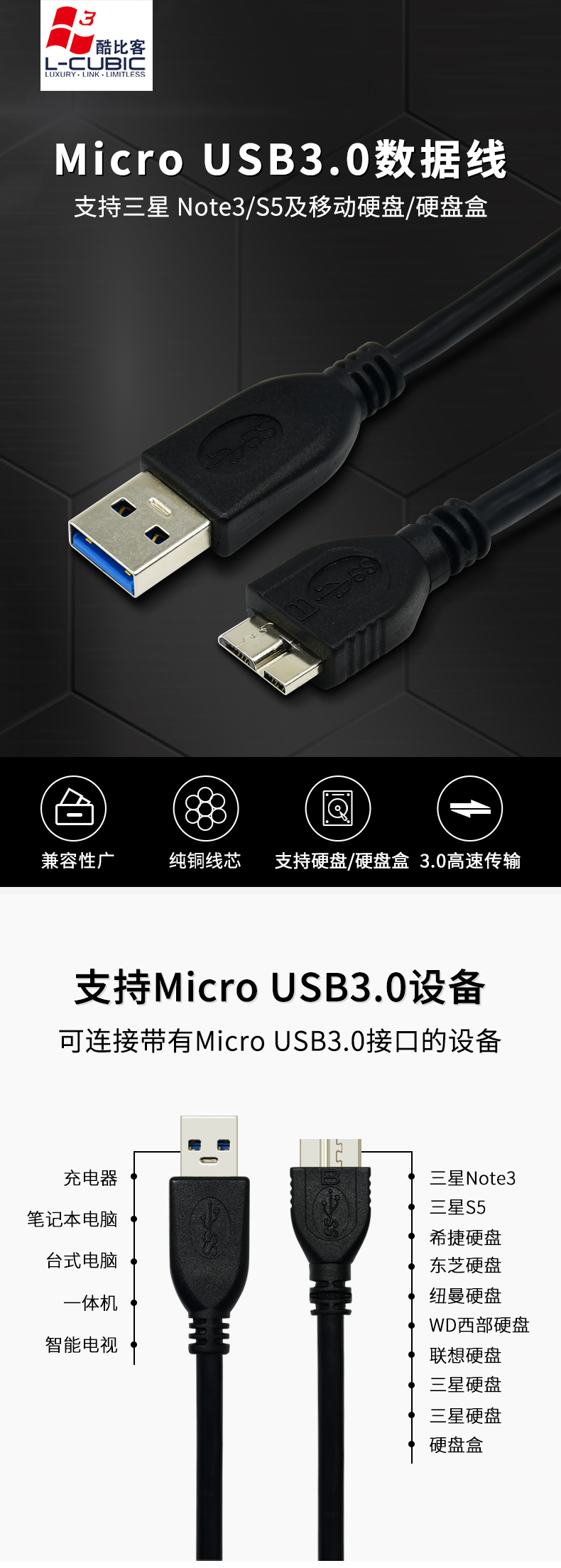 LCCPUSB3AMCBK-2M USB3.0硬盘线/USB/AM-Micro/黑色/2M