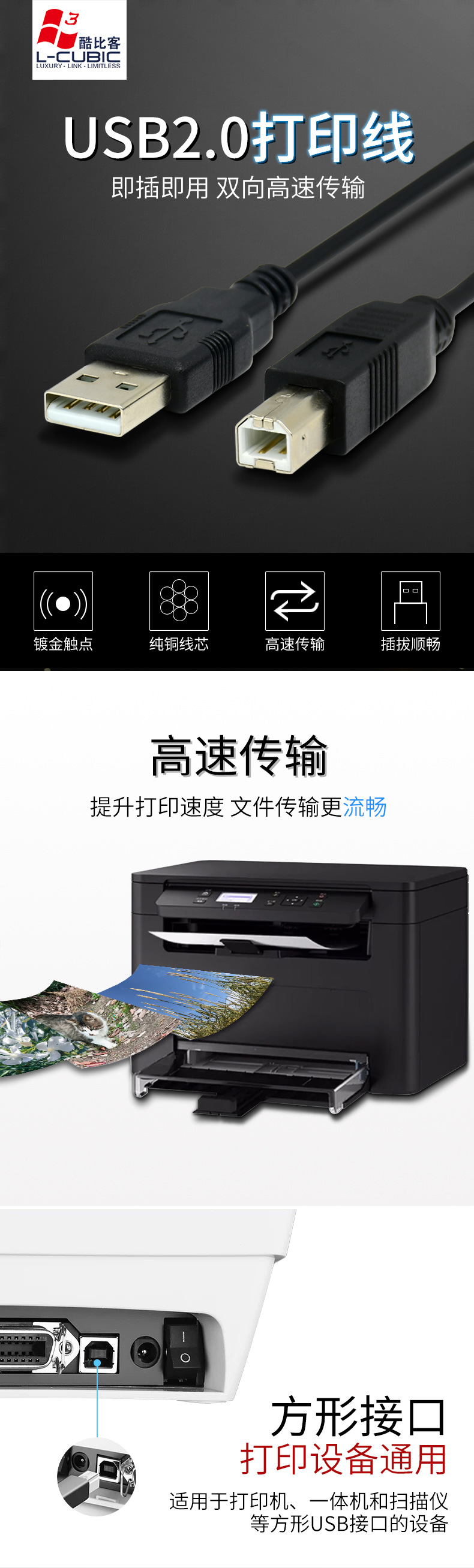 LCCPUSBAMBMBK-5M USB2.0打印线/USB/AM-BM/黑/5M