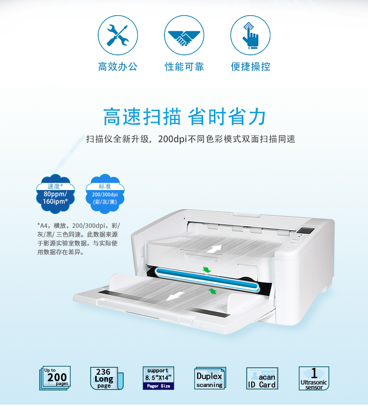 扫描速度80ppm/160ipm(A4/200、300dpi/彩色/灰度/黑白)