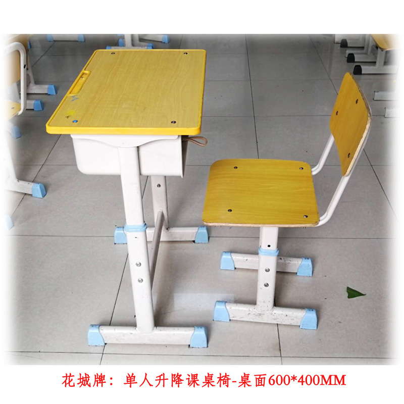 其它花城牌 12HC-163单人升降课桌椅 (桌面600*400mm高度760mm,用料厚度1.5mm,椅面多层板)桌面用料25MM高密度板塑料包边,桌架用料:1.5MM方管,桌斗用料:0.8MM钢板。