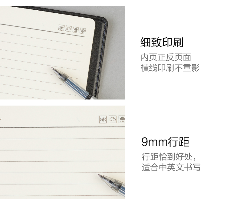 其它顺滑米黄双胶纸,纸张不刺眼,书写顺滑,不渗墨;正反横线不重影,9mm行距适合中英文书写;进口机订不掉页,细致车线,简约大气,结 实耐用;所有场合皆适用