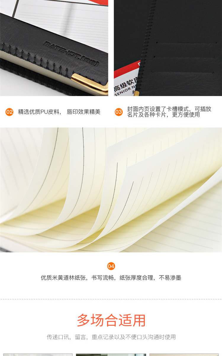 其它外壳优质PU皮,手感舒适,美观大方。内页70G道林纸,纸质上乘,吸水性强,不渗墨,书写更顺畅。做工精细,给到客户更高的使用体验。适用于家庭,办公使用。