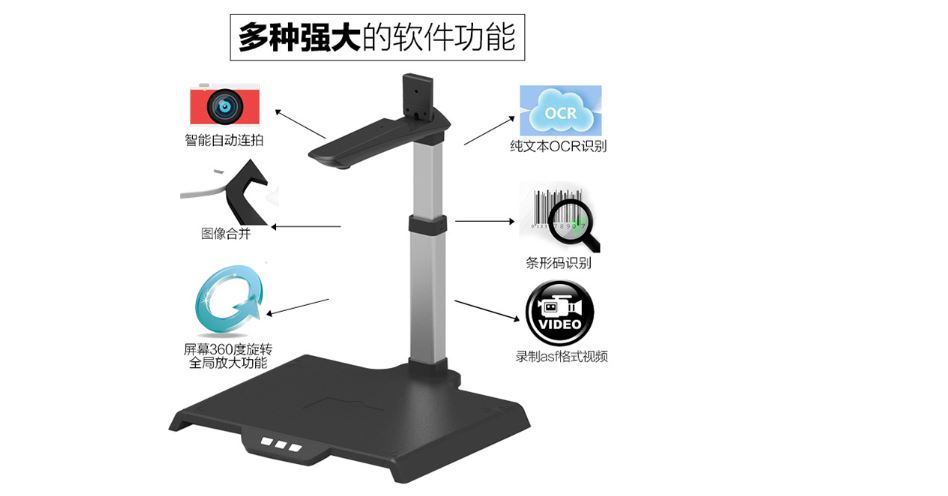 其它支持自动扶正,无底自动裁边,用户自定义裁边;支持多张同时裁边到多张输出;支持屏幕360度自由旋转,全局放大功能;可一键生成PDF或TIFF;支持生成多页PDF或TIFF;手动连拍多页TIF或PDF时可以增加或删减文档,支持文档顺序调整;支持智能连拍、支持感应纸张变化自动拍照 ;支持定时连拍、支持自定义定时拍照时间;可以录制asf格式视频;支持纯文本OCR识别;支持原比例打印或缩放打印;支持图像订制水印功能;支持图像合并和条形码识别功能;支持操作系统:Microsoft Windows 2000、XP、Vista、7、8、10