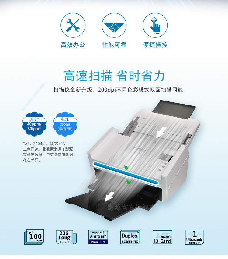 扫描速度40ppm/80ipm (A4,黑白/灰度/彩色模式,200dpi)